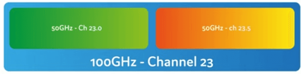 Otra forma de mantener una velocidad de 25Gbaudios (y reducir la dispersión cromática, etc.) es utilizar 2 láseres DWDM de 50GHz y crear un supercanal de 100GHz, compatible con el mux/demux DWDM normal de 100GHz: