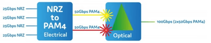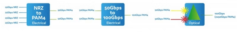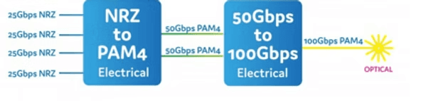 Mientras que la parte eléctrica de la QSFP28 sigue siendo de cuatro rutas NRZ de 25 Gbps (CAUI-4), la señal se convierte en dos rutas PAM4 de 50 Gbps y, a continuación, en una única ruta PAM4 de 100 Gbps. La conversión en dos pasos la realiza un DSP.