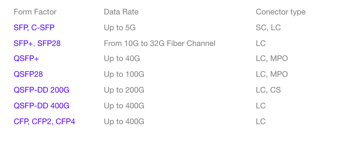 Los transceptores ópticos vienen en muchos factores de forma y para muchas aplicaciones diferentes. Considerando este hecho, hay que utilizar diferentes tipos de fibra y conectores ópticos.