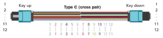 3/ Cable troncal MPO Tipo-C o Pares volteados: Los cables de tipo C tienen pares de fibras adyacentes cruzados, la posición 1 de un terminal se conecta a la posición 2 del otro extremo. Esto puede ser útil cuando los cables MPO Trunk se utilizan para agregar varios pares de fibras dúplex. Este tipo no se utiliza nunca para conexiones de transceptores ópticos.