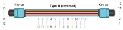 2/ Cable troncal MPO tipo B o invertido: Las posiciones individuales de las fibras están invertidas. En un cable de 12 fibras esto significa que la Posición 1 de un terminal se conecta a la Posición 12 del terminal opuesto.