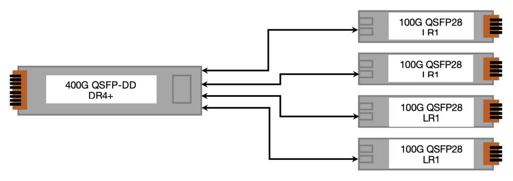Where does the single lambda attraction come from? Taking into account that a single lambda part can be use in the exact same scenario as a traditional part (point to point), one of the major improvements using them is the datacenter breakout application for 400G links allowing a smooth migration from 100G to 400G connections.