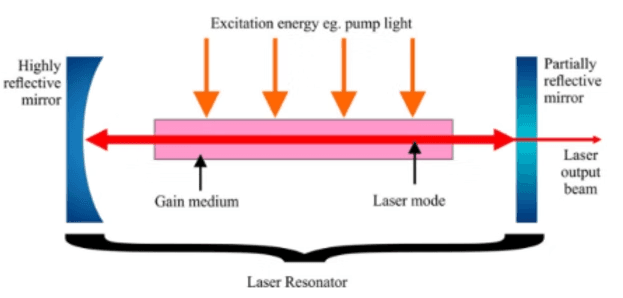 La luz se mueve a través del material entre los dos espejos que reflejan la luz de un lado a otro. Uno de los espejos, sin embargo, sólo refleja parcialmente la luz, dejando escapar parte de ella. La luz que se escapa constituye el rayo láser.